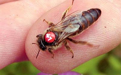 Die Königin bekommt vom Imker ein kleines Plättchen auf den Rücken, durch die Farbe kann er das Geburtsjahr erkennen und durch die Nummer die Stockzugehörigkeit.