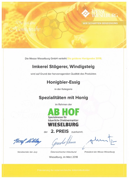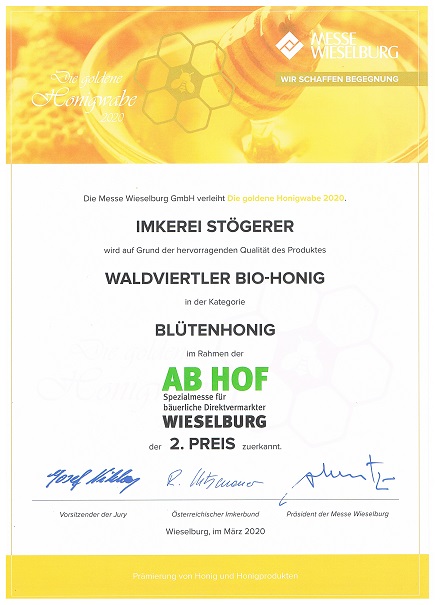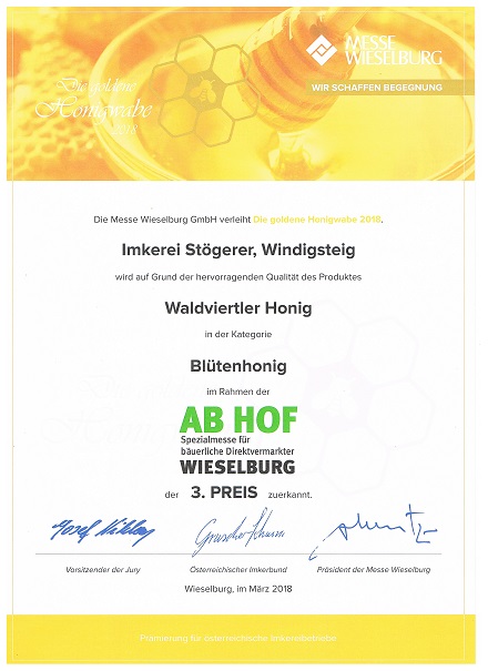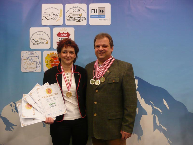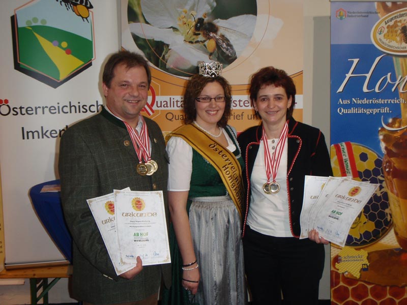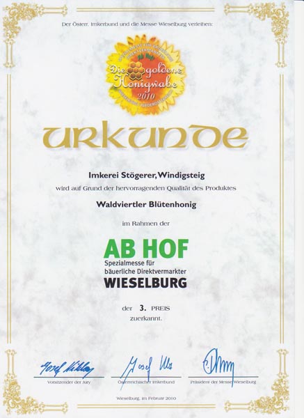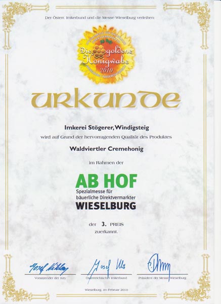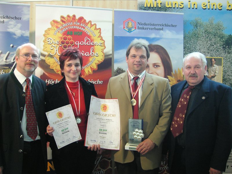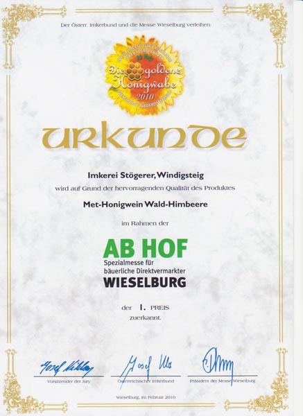 2010 wurden wir im Zuge der Ab Hof Messe mit Gold für unseren Met Honigwein Wald-Himbeere, Silber für Met Honigwein, Silber für Met Honigwein Kirsch, Bronze für unseren Waldviertler Cremehonig sowie Bronze für Waldviertler Blütenhonig ausgezeichnet.