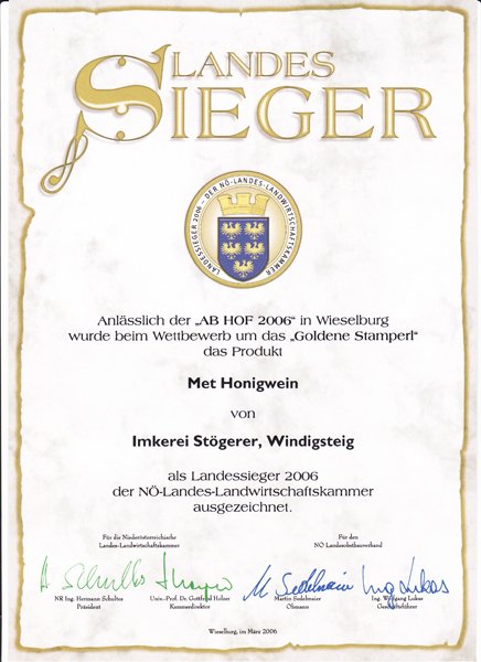 2006 konnten wir mit unserem Met Honigwein eine Goldmedaile, die Goldene Honigwabe und den Landessieger Niederösterreich erreichen.