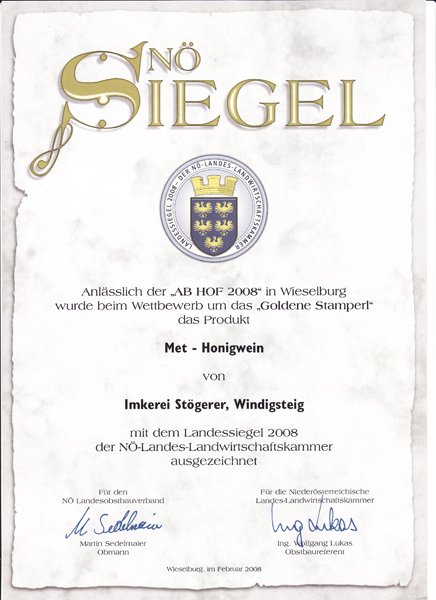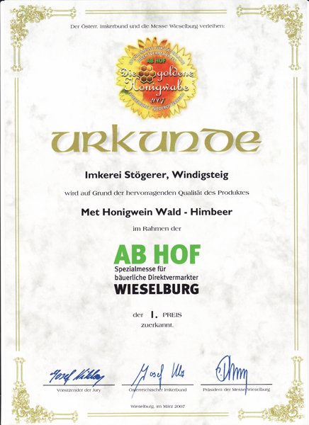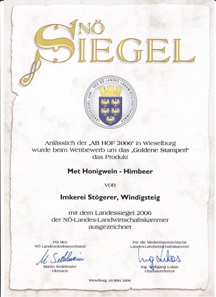 2007 konnten wir mit unserem Met Honigwein Wald-Himbeer den ersten Rang (Goldmedaille) erreichen, das NÖ-Gütesiegel und den NÖ-Landessieger erreichten wir mit unserem Standard Met Honigwein.