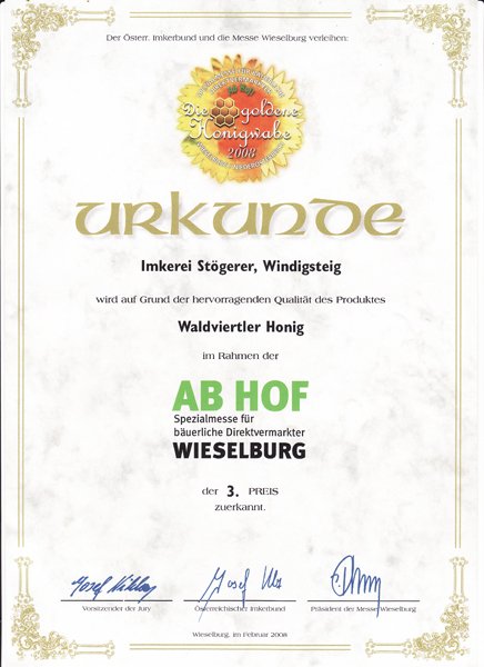 Auszeichnung 2002 im Zuge der Wieselburger Ab Hof Messe mit einem dritten Rang für unseren Waldviertler Honig