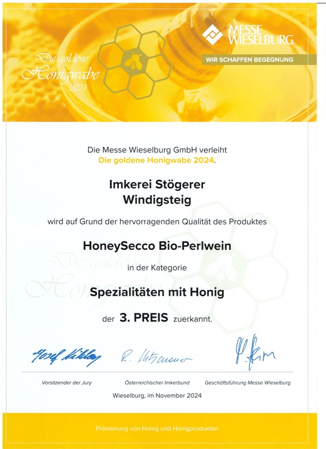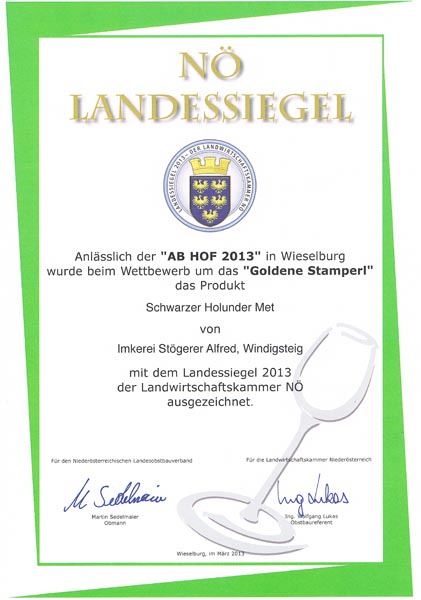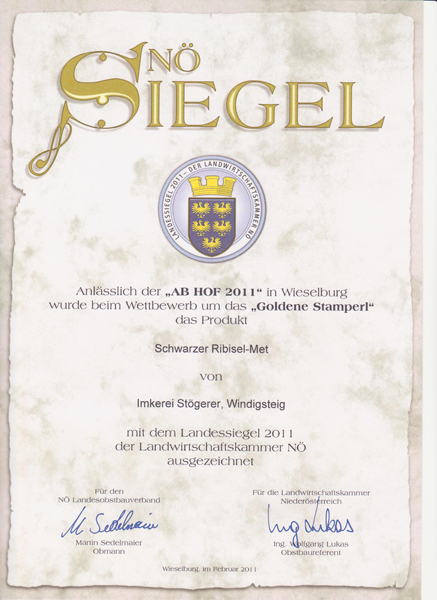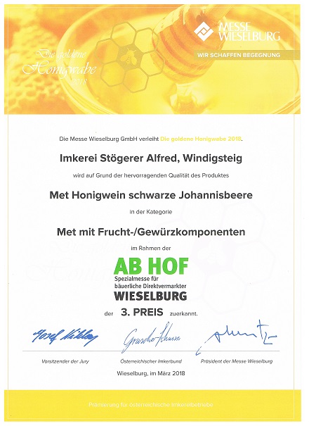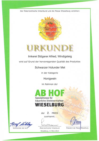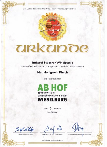 2009 wurden wir im Zuge der Ab Hof Messe mit dem NÖ Gütesiegel für Met Honigwein Kirsch und einem dritten Rang Medaille in Bronze ausgezeichnet.