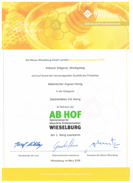 Honig: 1. Preis Gold für: Waldviertler Schoko Honig und 1.Preis Gold für: Waldviertler Ingwerhonig, 2. Preis Silber für: Waldviertler Mohnhonig.