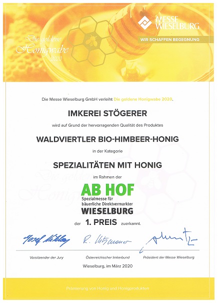 1er Preis Gold für: Waldviertler BIO-Himbeer Honig