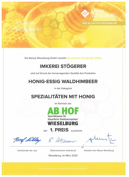 1er Preis Gold für: BIO- Honig-Essig-Waldhimbeerg,