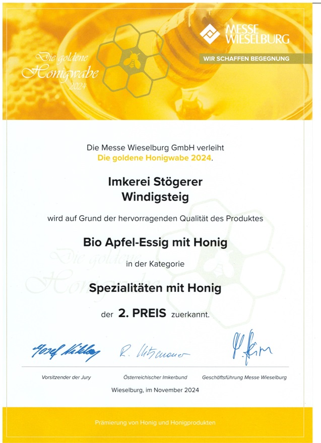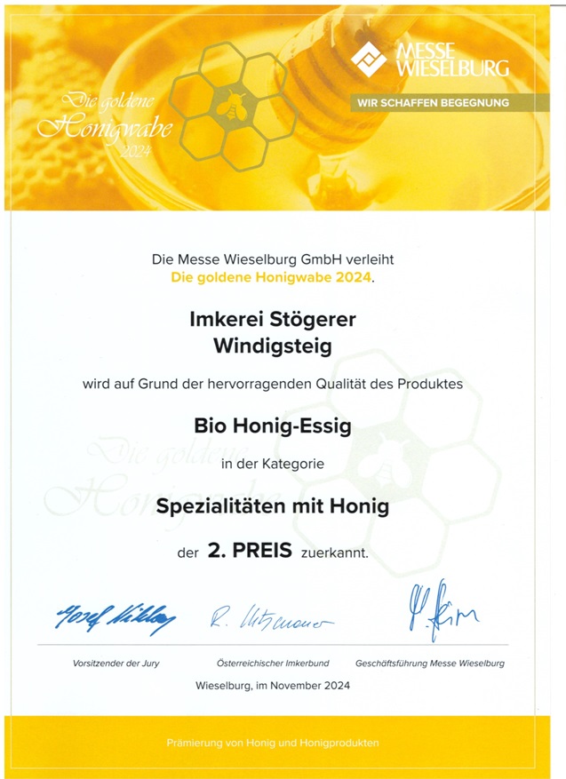 NEU unser Honig-Essig: 1. Preis Gold für: Honigessig aus Met, 2. Preis Silber für: Honigbier-Essig,