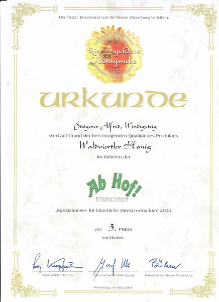 Auszeichnung 2003 im Zuge der Wieselburger Ab Hof Messe mit einem dritten Rang für unseren Waldviertler Honig.