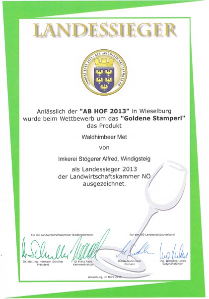 Gold und Landessieger für: Schwarzen Ribisel-Met, Silber und Landessiegel für: Waldhimbeer-Met, Bronze und Landessiegel für: Schwarzer Holunder-Met, Landessiegel für: Met Hoigwein Natur, Bronze und Gütesiegel für: Cremehonig,