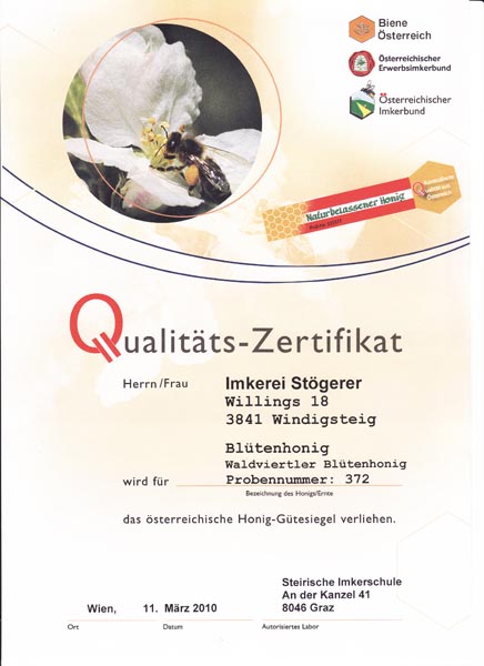 Qualitätszertifikat Gütesiegel 2010 für Chremehonig, Blütenhonig und Blüten-Waldhonig