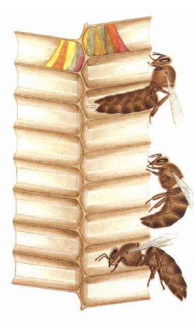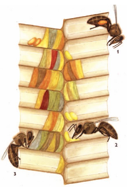 Sie inspiziert die Zelle, ob sie leer ist, danach schreitet sie etwas weiter, hebt dabei den Hinterleib, um ihn sodann in die erwählte Zelle zu versenken und dort das Ei abzulegen. Eine Königin soll imstande sein, während der Hauptlegezeit täglich 2000 bis 3000 Eier zu legen.