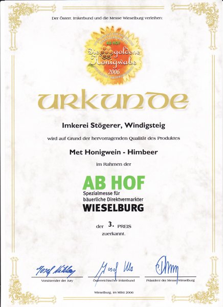 2006 konnten wir mit unserem Met Honigwein eine Goldmedaile, die Goldene Honigwabe und den Landessieger Niederösterreich erreichen.