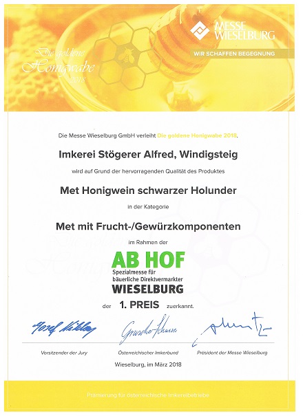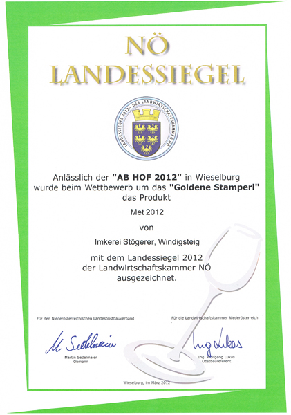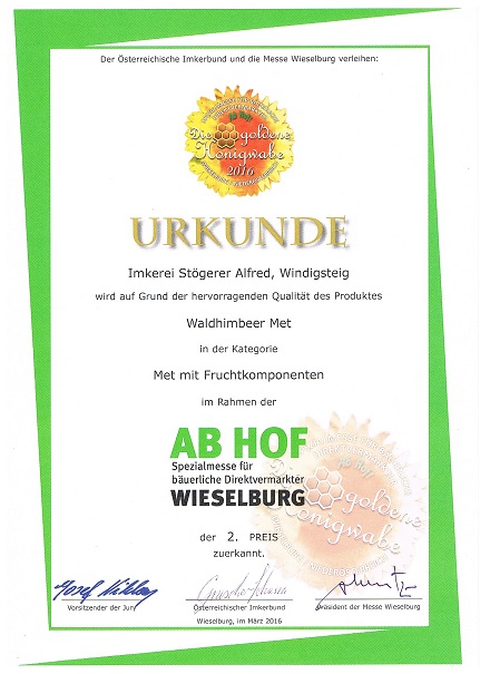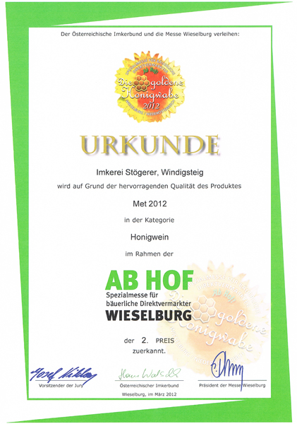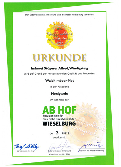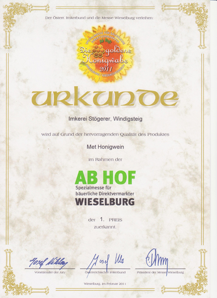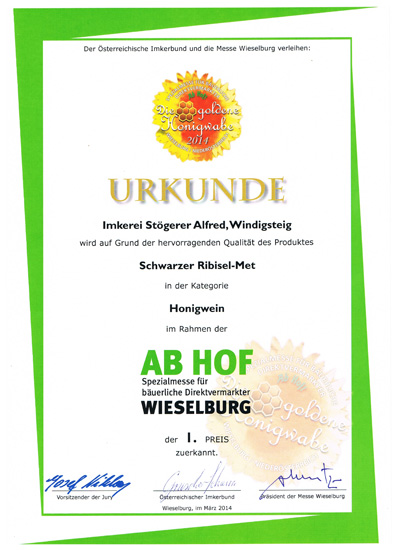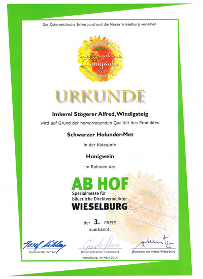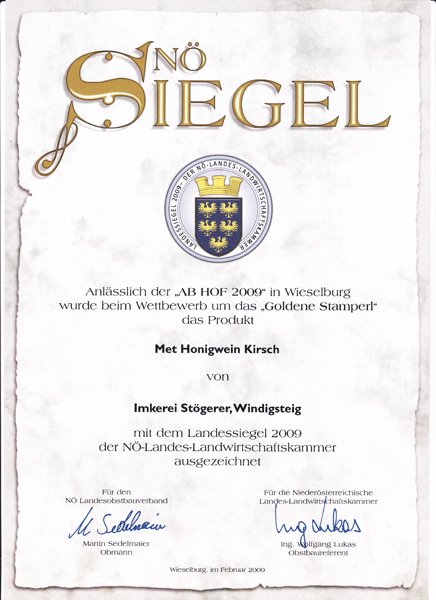 2009 wurden wir im Zuge der Ab Hof Messe mit dem NÖ Gütesiegel für Met Honigwein Kirsch und einem dritten Rang Medaille in Bronze ausgezeichnet.