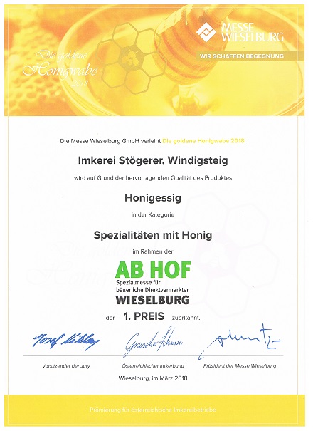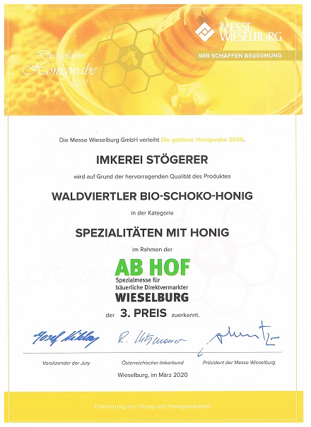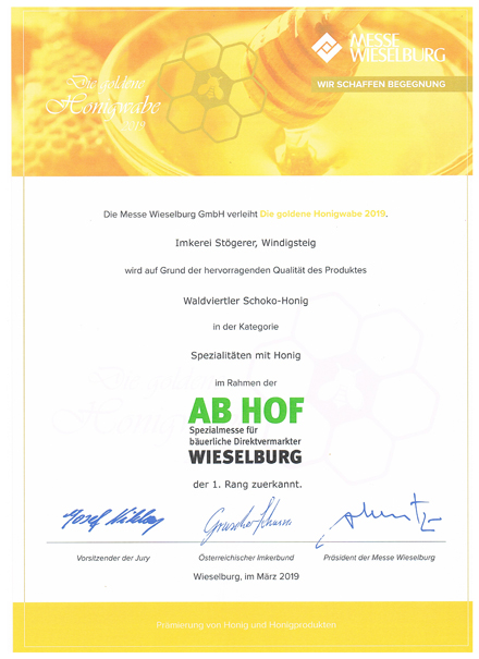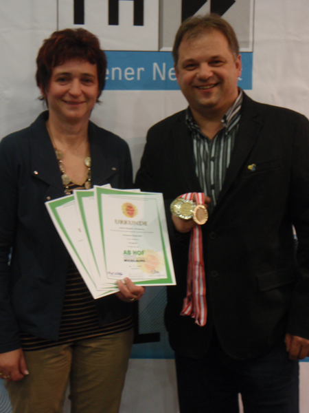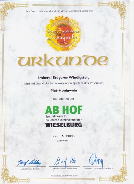 2010 wurden wir im Zuge der Ab Hof Messe mit Gold für unseren Met Honigwein Wald-Himbeere, Silber für Met Honigwein, Silber für Met Honigwein Kirsch, Bronze für unseren Waldviertler Cremehonig sowie Bronze für Waldviertler Blütenhonig ausgezeichnet.