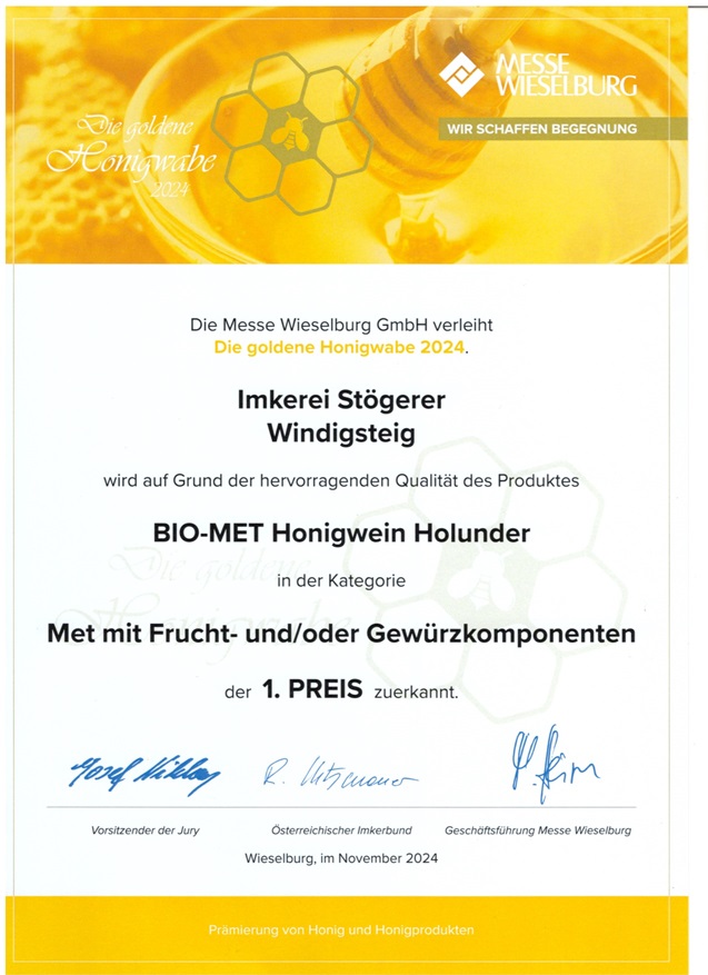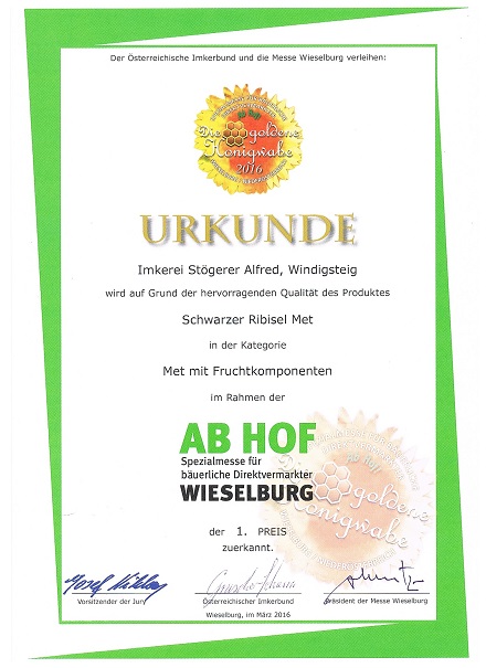 Gold und Landessieger für: Schwarzen Ribisel-Met, Silber und Landessiegel für: Waldhimbeer-Met, Bronze und Landessiegel für: Schwarzer Holunder-Met, Landessiegel für: Met Hoigwein Natur, Bronze und Gütesiegel für: Cremehonig,