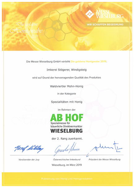 Honig: 1. Preis Gold für: Waldviertler Schoko Honig und 1.Preis Gold für: Waldviertler Ingwerhonig, 2. Preis Silber für: Waldviertler Mohnhonig.