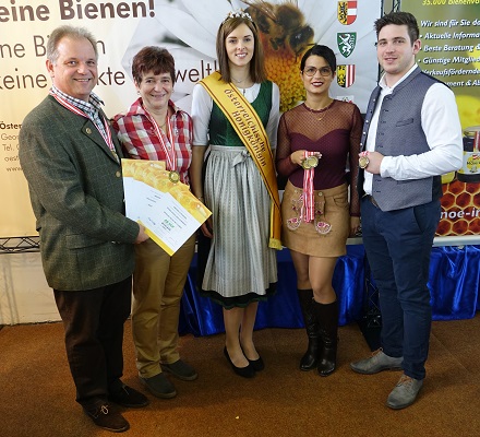 Bild von Rechts Hannes und Astrid, Honigkönigin Jasmin1, Bettina und Alfred bei der Übergabe in Wieselburg