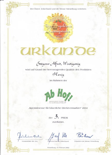 Auszeichnung 2002 im Zuge der Wieselburger Ab Hof Messe mit einem dritten Rang für unseren Waldviertler Honig