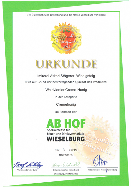 Auszeichnung bei der "Ab Hof Messe 2012" Gold und Landessieger für Schwarzer-Ribisel-Met Silber und Landessiegel für Met Honigwein, Dritter Preis in Bronze für Waldviertler Cremehonig,
