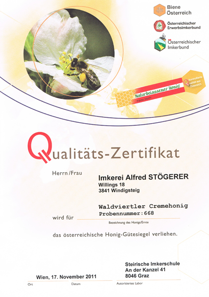 Qualitätszertifikat Gütesiegel 2011 für Chremehonig, Blütenhonig