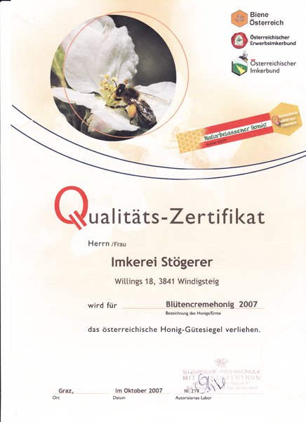 Qualitätszertifikat Gütesiegel 2007 für Chremehonig und Blütenhonig